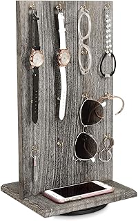 Ikee Design 木製回転両面ジュエリーディスプレイスタンド 回転オーガナイザー 32フック付き イヤリングディスプレイ フック付きキーチェーンディスプレイ コーヒー色 幅9インチ x 奥行き7.5インチ x 高さ16.5インチ